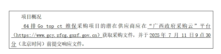 簡(jiǎn)要規(guī)格描述或項(xiàng)目基本概況介紹、用途:64排Go top ct 維保1項(xiàng)。如需進(jìn)一步了解詳細(xì)內(nèi)容,詳見競(jìng)爭(zhēng)性磋商文件。