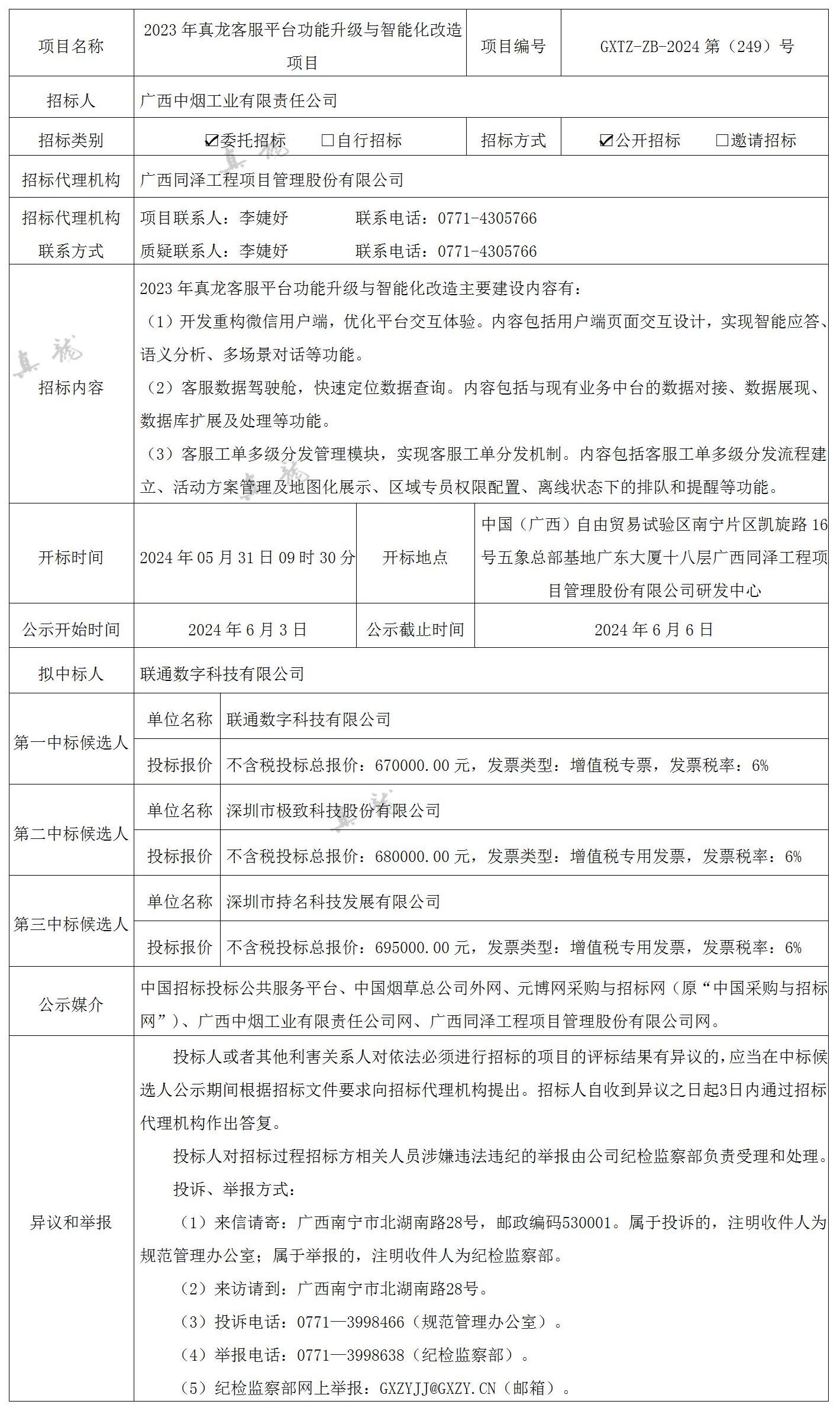 廣西中煙工業(yè)有限責(zé)任公司2023年真龍客服平臺功能升級與智能化改造項目(項目編號:GXTZ-ZB-2024第(249)號)中標候選人公示