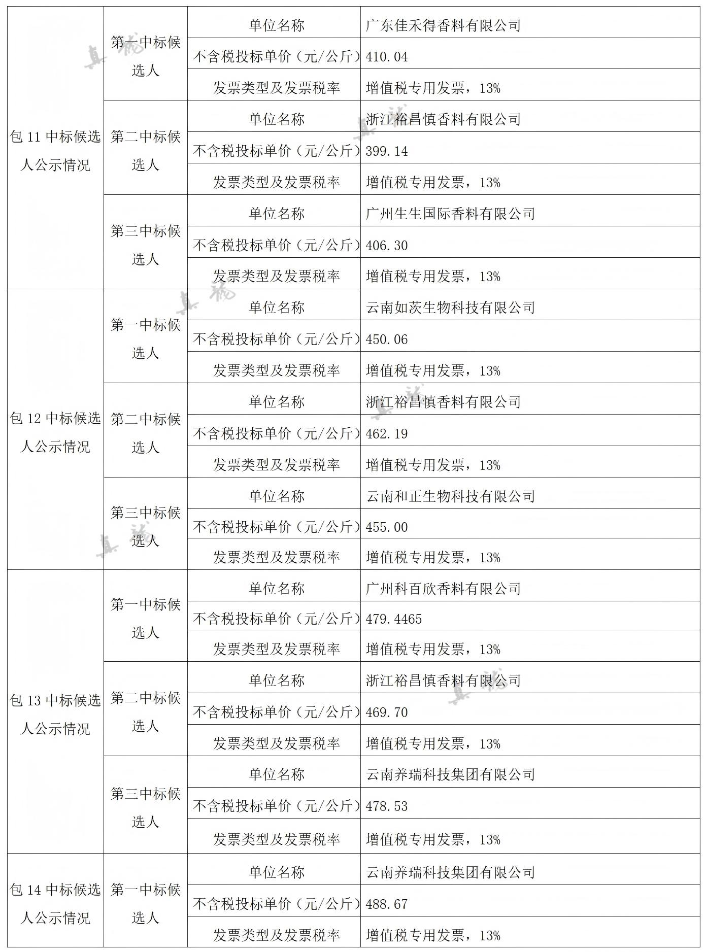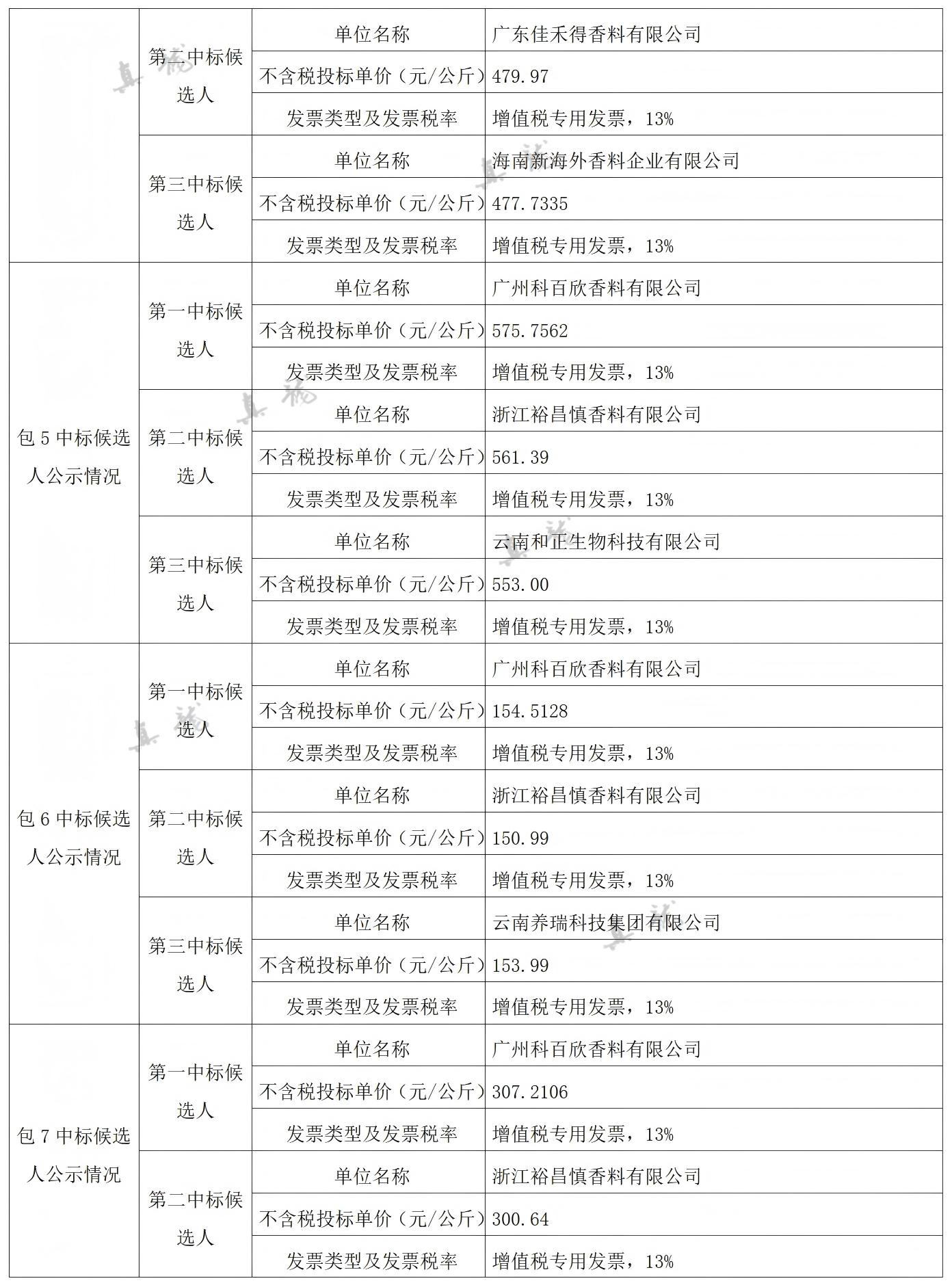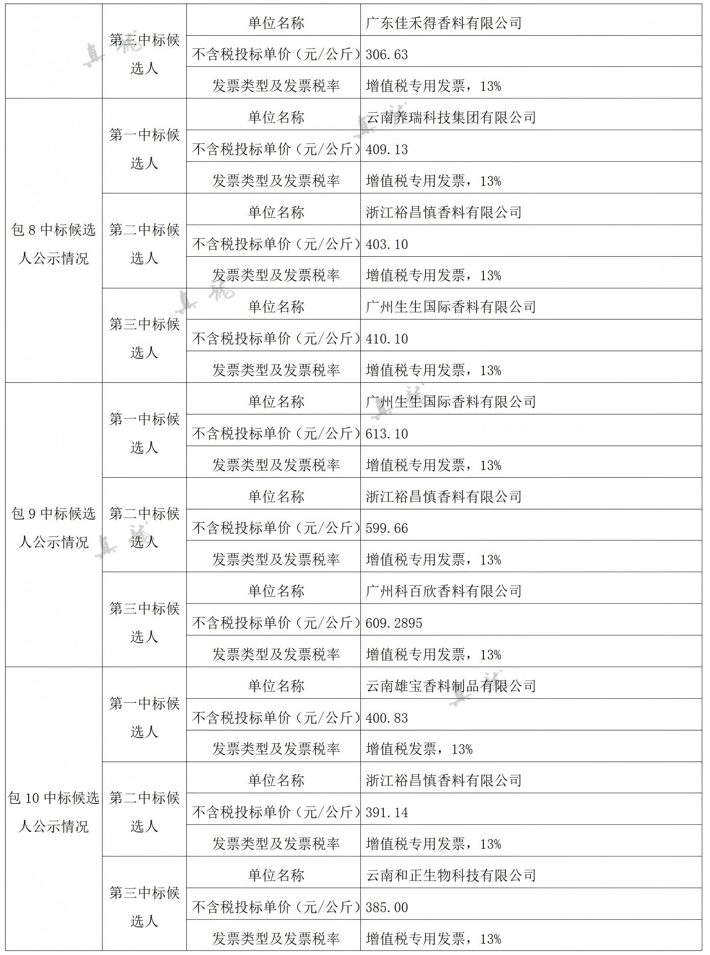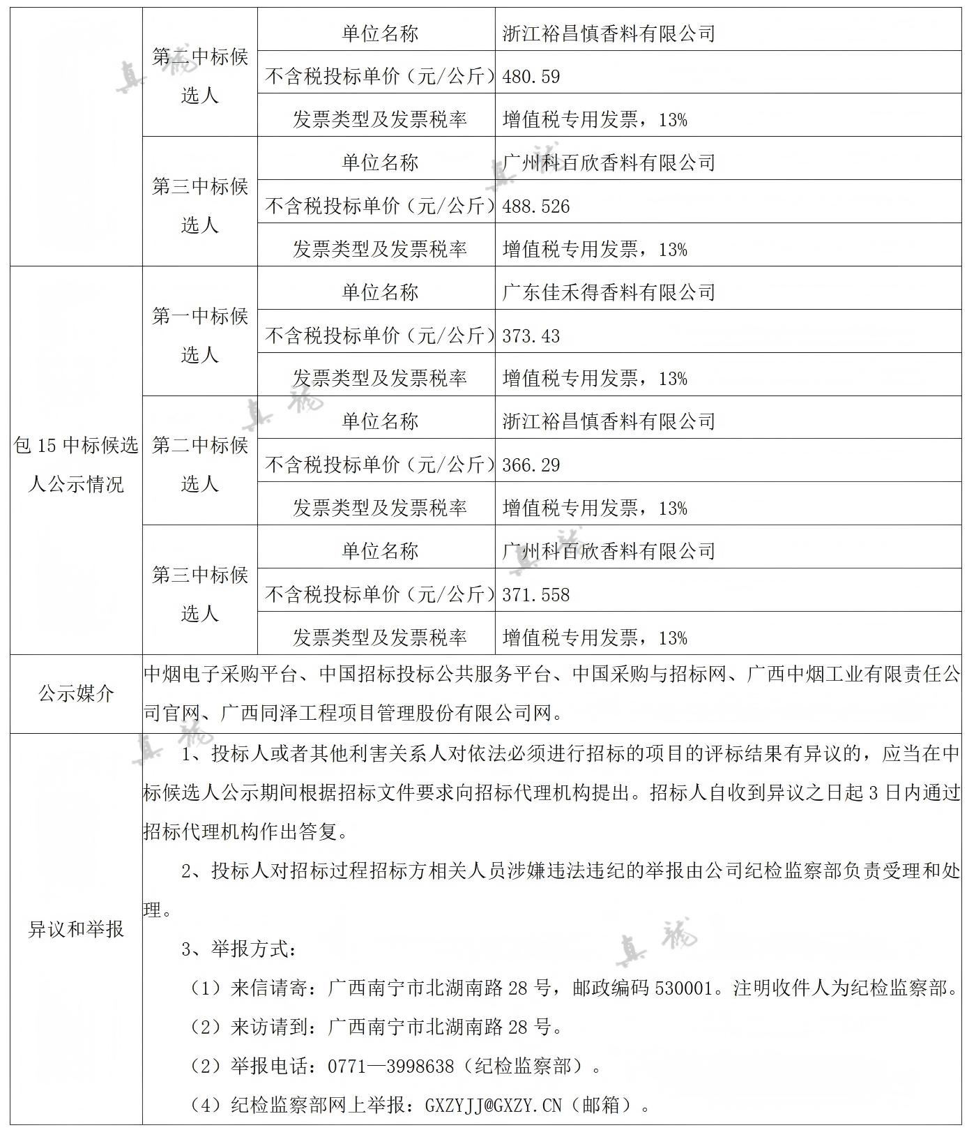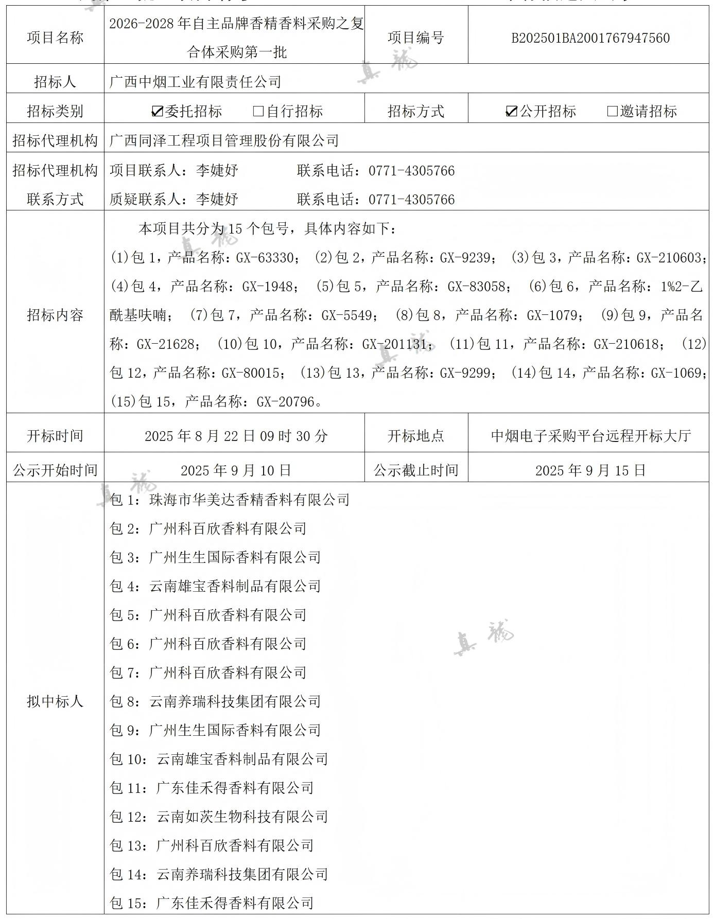 廣西中煙工業(yè)有限責(zé)任公司2026-2028年自主品牌香精香料采購之復(fù)合體采購第一批(項目編號:B202501BA2001767947560)中標候選人公示
