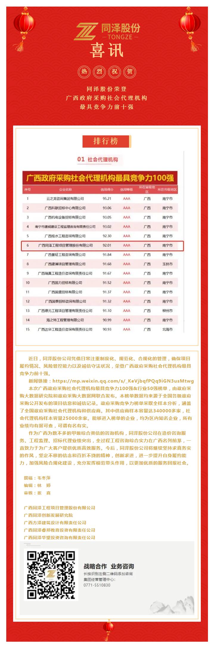 喜訊|同澤股份榮登廣西政府采購社會代理機構最具競爭力前十強